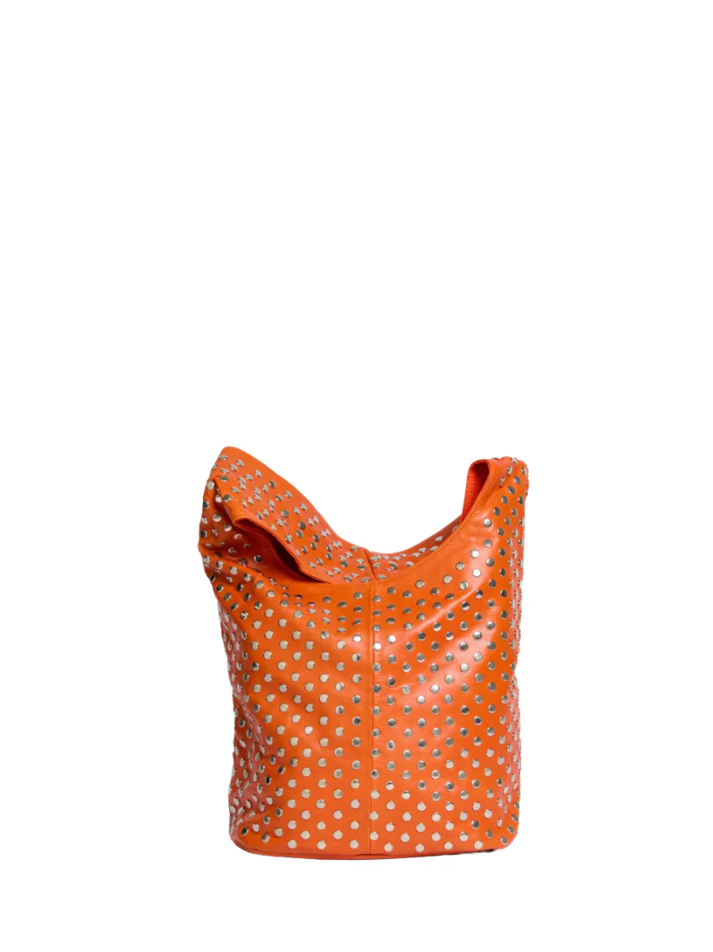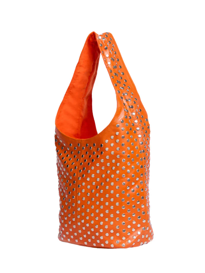 El bolso Airlie naranja pequeño es el accesorio ideal para quienes buscan estilo y funcionalidad. Fabricado en piel de cordero de alta calidad, este bolso destaca por su color blanco vibrante, complementado con tachuelas metálicas plateadas que le otorgan un toque edgy y sofisticado. Su diseño compacto lo convierte en el acompañante perfecto para llevar lo esencial en cualquier salida, añadiendo un toque audaz y moderno a cualquier look. Eleva tu outfit con este bolso de diseño atrevido y detalles únicos.