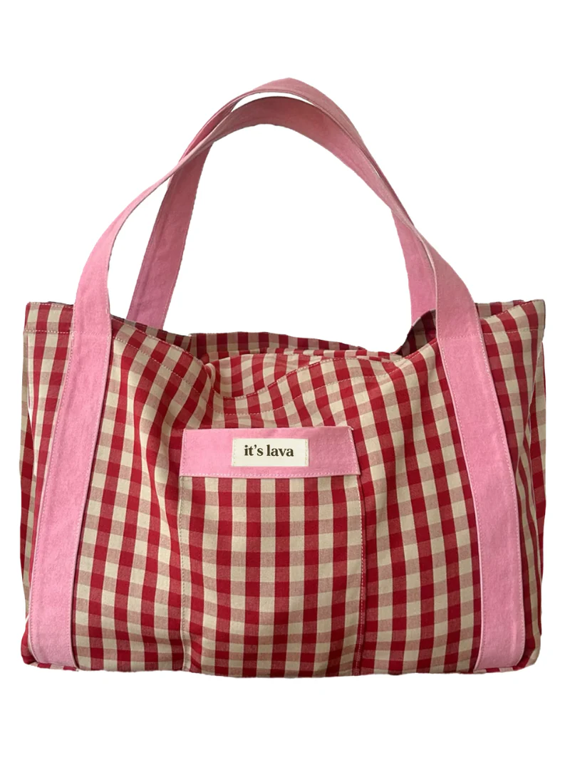 Bolso grande estilo shopper de loneta con asas para colgarlo al hombro. En estampado vichy de color rojo y rosa.