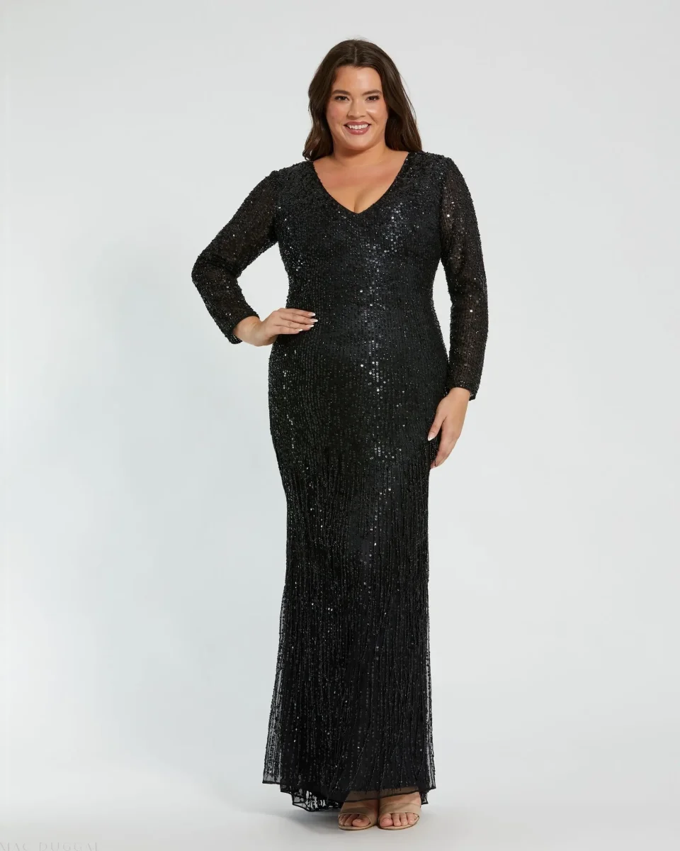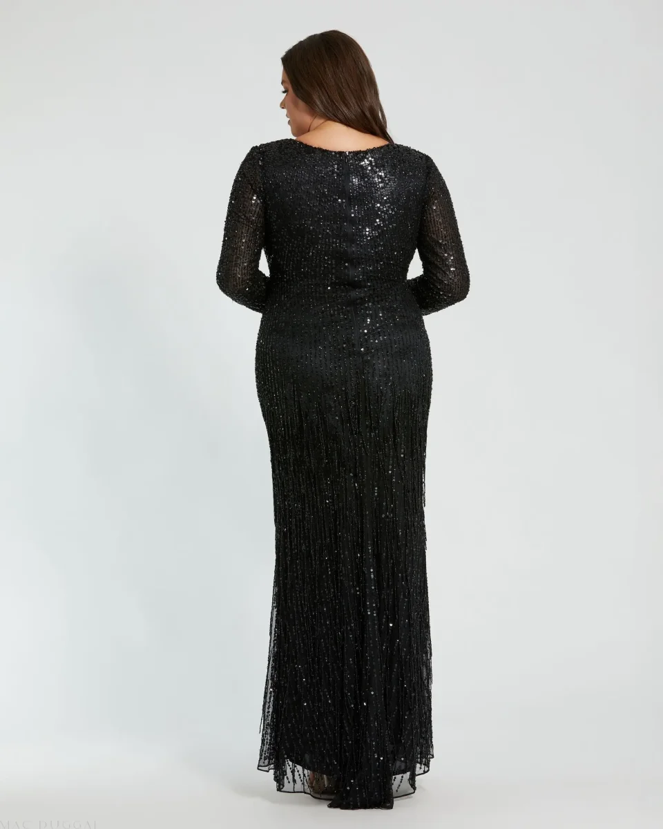 Make a statement in our Long Sleeve V-Neck Beaded Fringe Gown. Featuring intricate beadwork and elegant fringe details, this gown offers a stunning V-neckline and long sleeves, perfect for formal events and glamorous occasions.