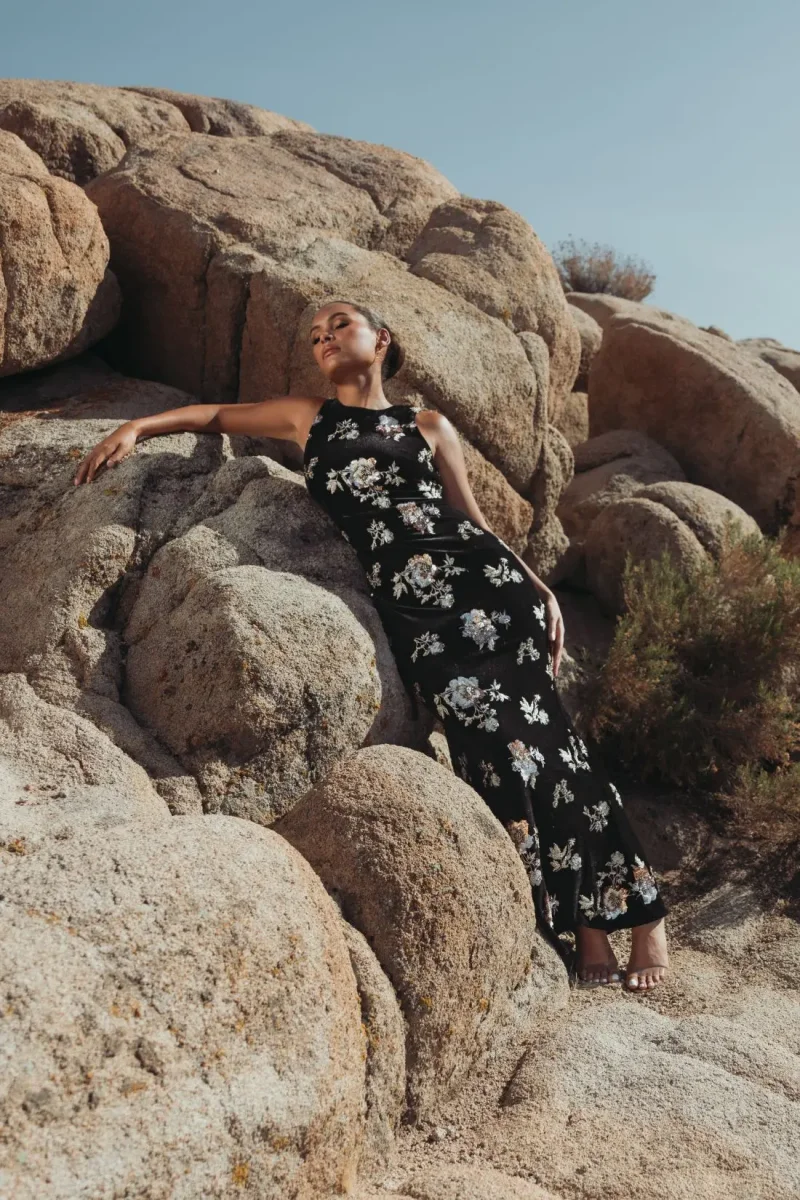 Perfect for black-tie weddings, galas, or red carpet moments, this black velvet column gown stuns with metallic floral embroidery and shimmering embellishments. Its iridescent finish creates a striking color shift, revealing hints of olive green over a bronze base as it catches the light with every step.