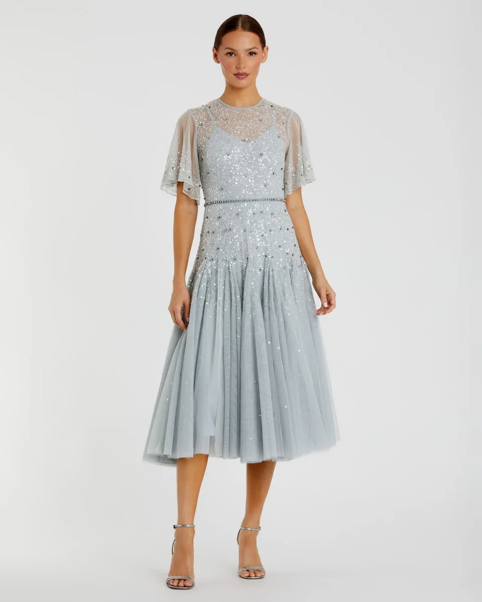 Exquisite hand-embellished mesh overlay dress, featuring a partially lined bodice and a fully lined skirt for a sleek fit. The sheer unlined sleeves add a delicate touch, while the high neckline with an illusion high neck overlay creates a sophisticated, dramatic look. Short flutter sleeves and a rhinestone-encrusted waist detail complete the design, making this dress perfect for formal events, galas, or evening soirées.