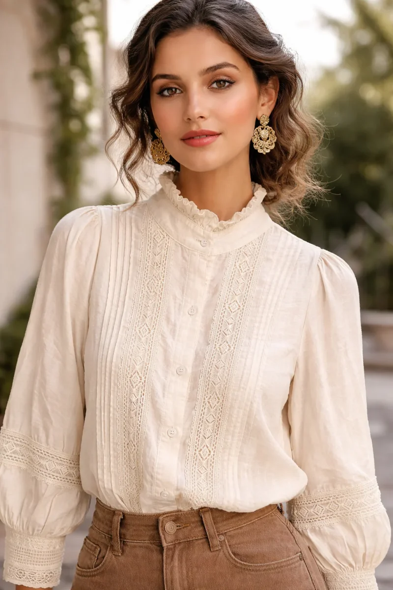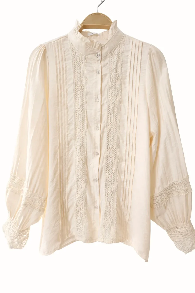 Esta blusa de manga larga con encaje y cuello alto está confeccionada con un tejido suave y delicado. Su diseño entallado y los detalles de encaje y pliegues aportan un toque romántico y elegante. Ideal para la oficina, citas o looks diarios con estilo femenino.