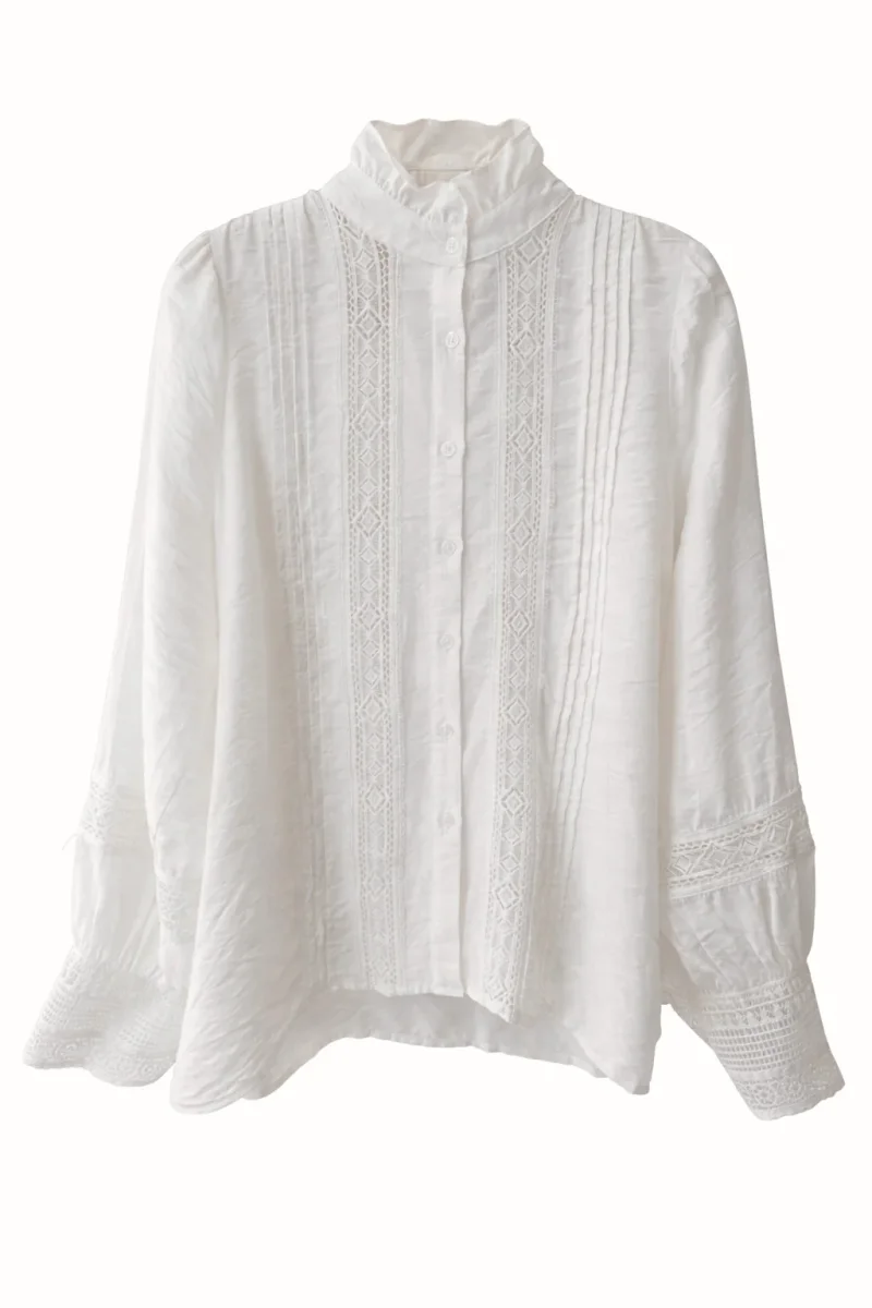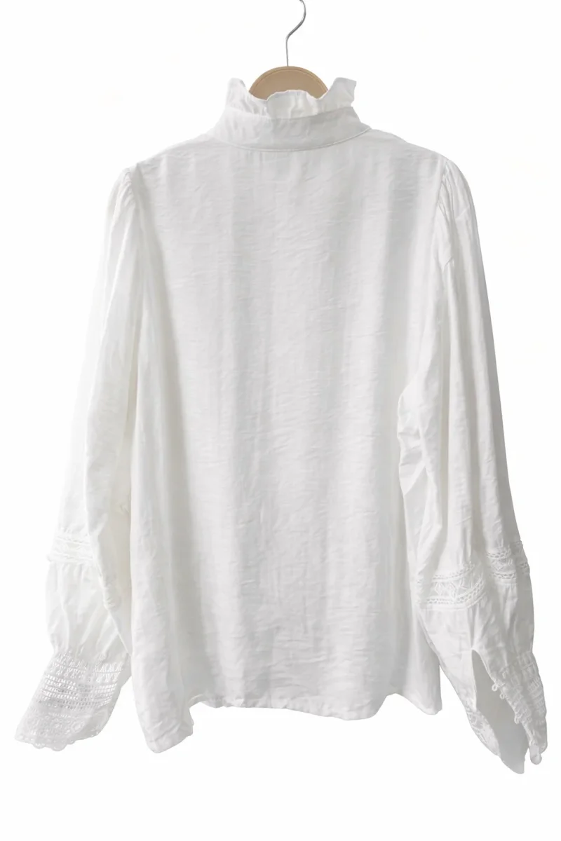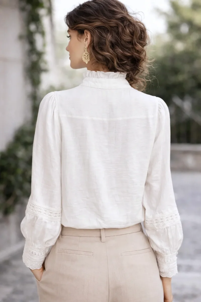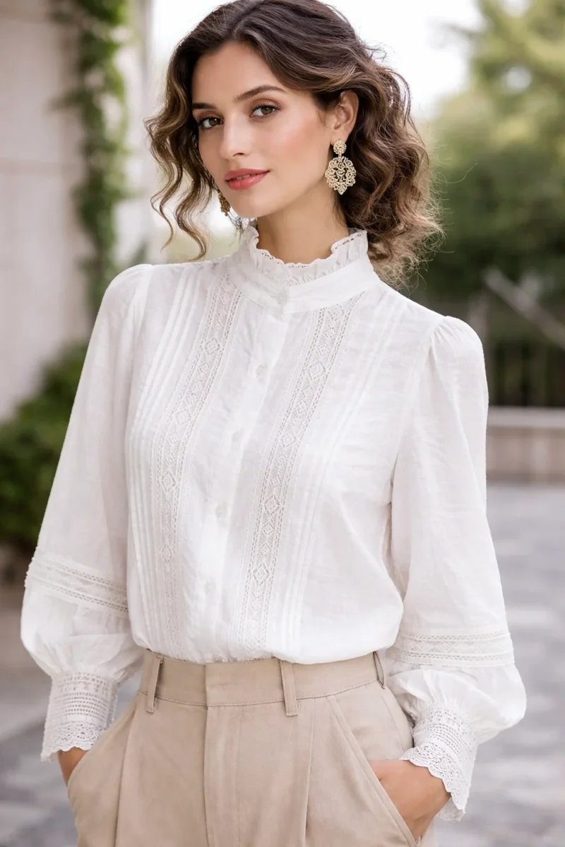 Esta blusa de manga larga con encaje y cuello alto está confeccionada con un tejido suave y delicado. Su diseño entallado y los detalles de encaje y pliegues aportan un toque romántico y elegante. Ideal para la oficina, citas o looks diarios con estilo femenino.
