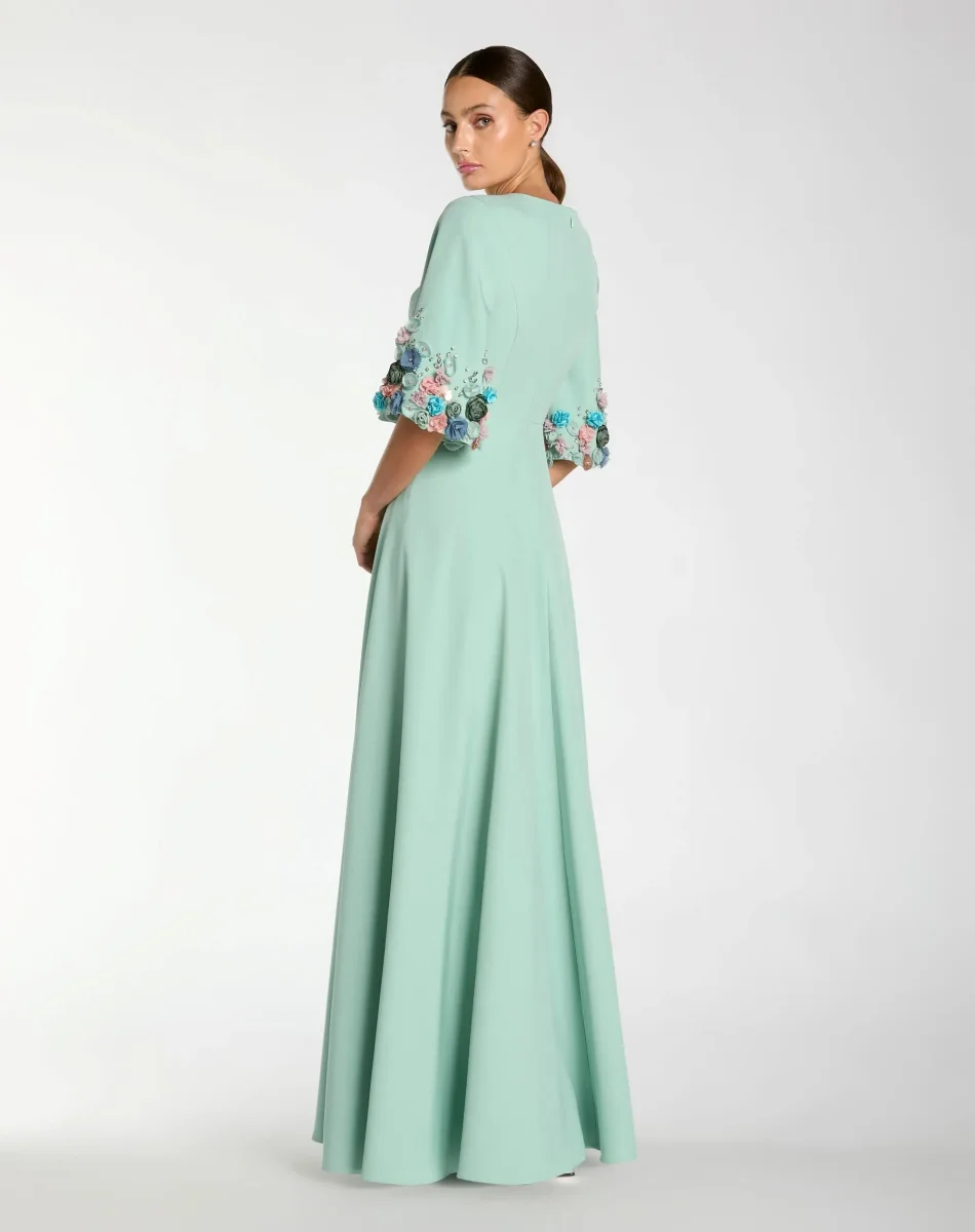 - 3/4 sleeves with 3D flower detailing and rhinestone embellishments