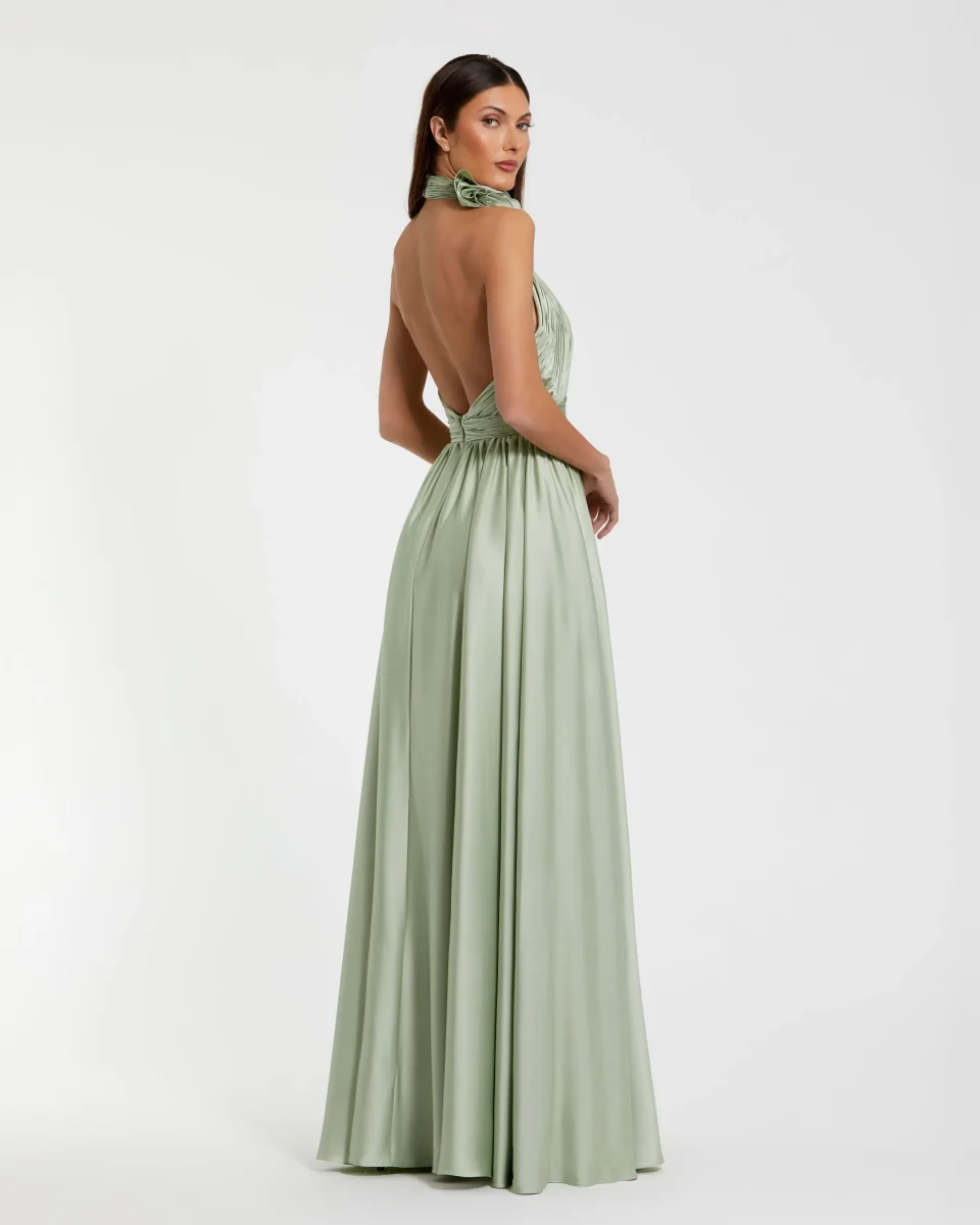 Elegant chiffon gown with a ruched bodice and waistband, an open back, and a rosette halter neckline. The flowing floor-length skirt features a thigh-high slit.