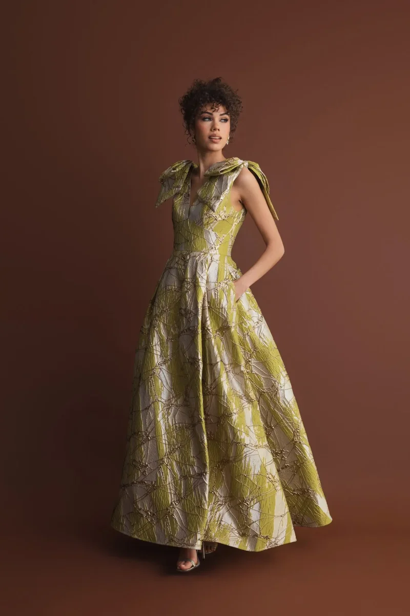 - Sculptural bow detail on shoulders