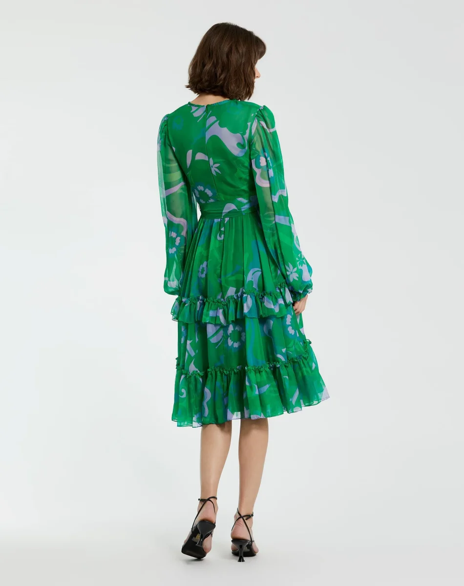 • Green Printed Chiffon Bishop Sleeve Tie Waisted Ruffle Midi Dress