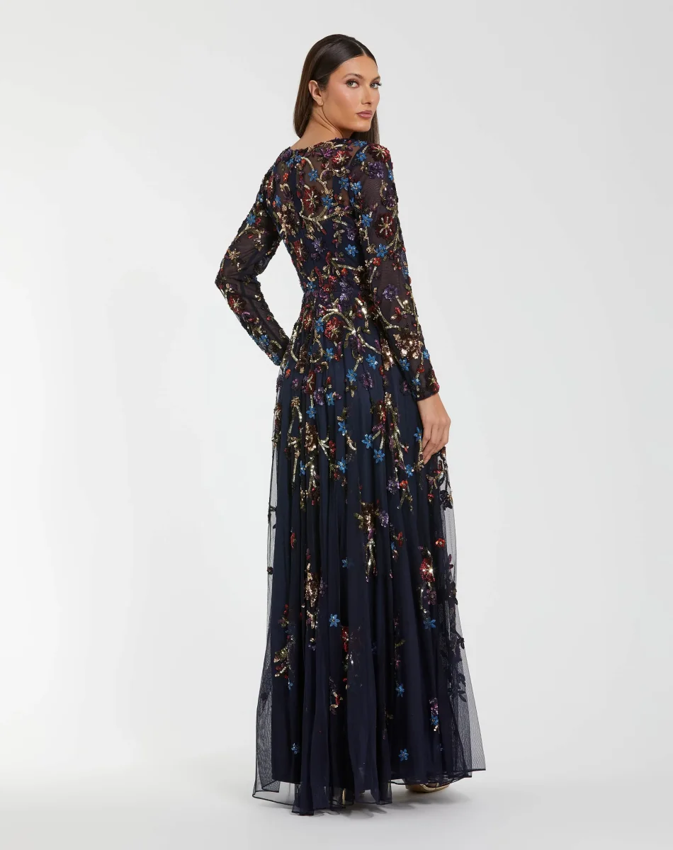 Radiate elegance in this breathtaking beaded gown. Featuring a sophisticated illusion neckline, sheer long sleeves, and multicolor floral embellishments, it’s the epitome of evening glamour.