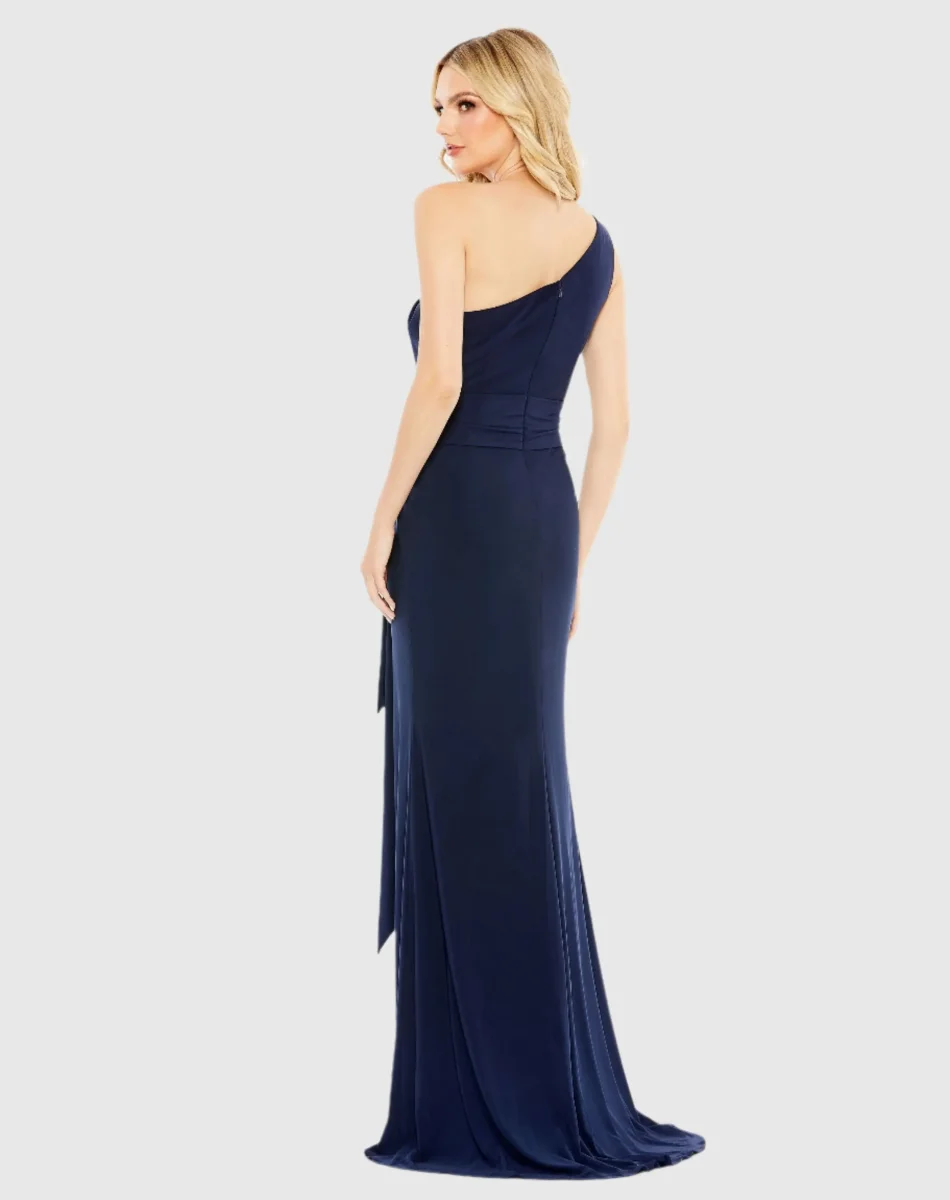 Elevate your evening look with our Jersey Fabric Trumpet Gown. Featuring a stylish one-shoulder neckline and a flattering belted waist, this gown offers a sleek, sophisticated silhouette perfect for special occasions, galas, or formal events.