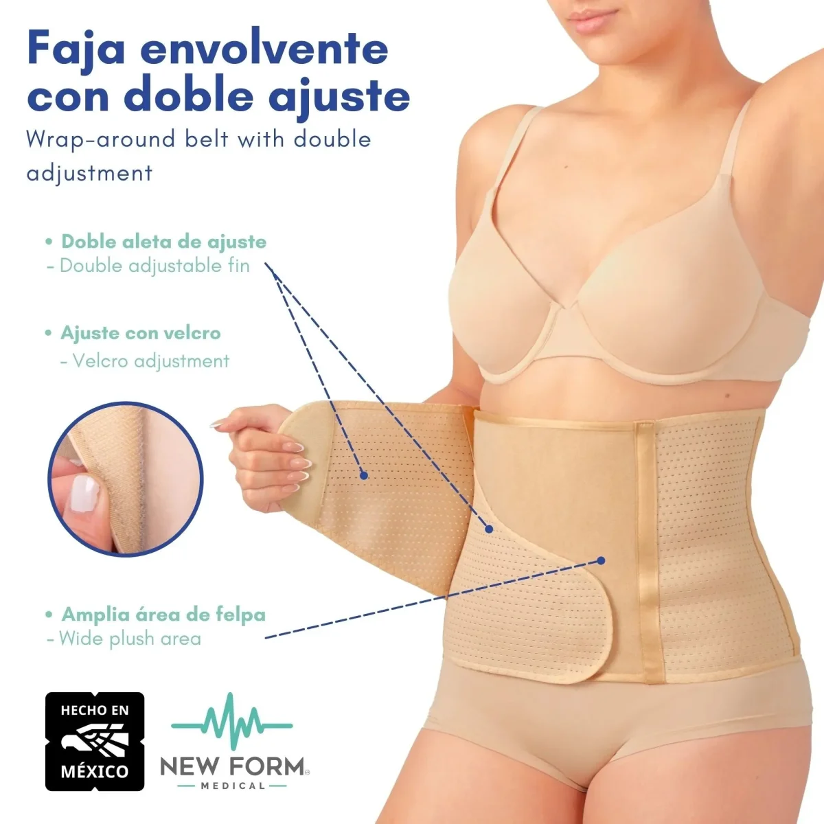 Es una faja moldeadora médica versátil, fabricada en México con materiales suaves y resistentes.