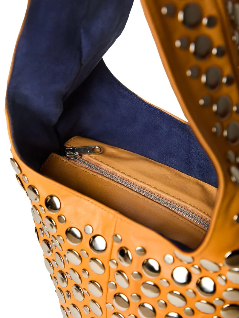 El bolso Noosa camel-azul pequeño es el accesorio perfecto para quienes desean destacar con un estilo atrevido. Fabricado en piel de cordero de alta calidad, este bolso se complementa con detalles de tachuelas metálicas plateadas, creando un look edgy y sofisticado. Su tamaño compacto lo convierte en el aliado ideal para llevar lo esencial con estilo y elegancia. Este bolso es perfecto para añadir un toque audaz que eleva cualquier look, fusionando modernidad y personalidad en un solo accesorio.