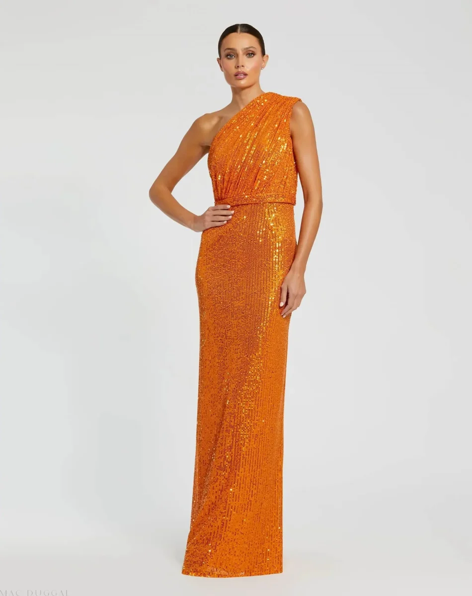 Illuminate the night in our Sequined Ruched One Shoulder Gown, crafted from dazzling sequin fabric, this gown is a show-stopping look. Featuring a chic one-shoulder neckline and sleeveless design, it’s your go-to for making a statement at any special occasion.