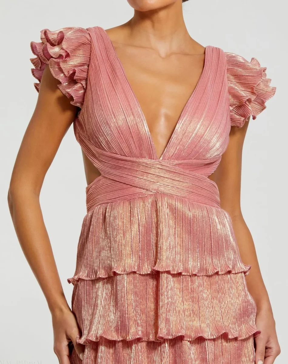 Crafted from a shimmering metallic plisse fabric, this gorgeous gown features a tiered ruffle skirt, ruffled sleeves, and a stunning lace up back, perfect for making a statement at any formal event.