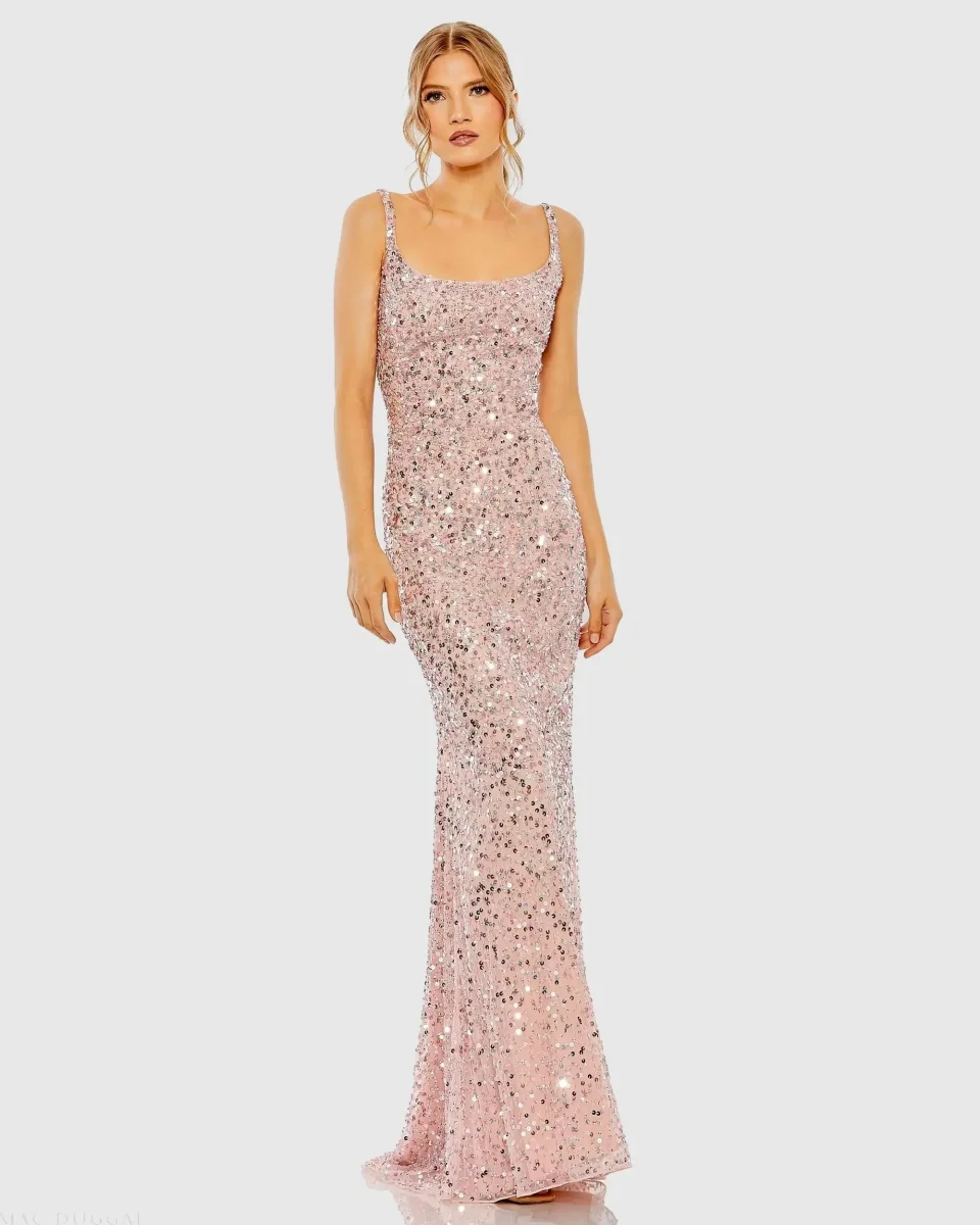 This stunning sequined dress features a dazzling sequin mesh overlay for added sparkle and glamour. The flattering scoop neckline and sleeveless design create an elegant look, while the low back with zipper closure adds a chic touch. A small sweeping train completes the graceful silhouette, making it perfect for any formal event or special occasion.