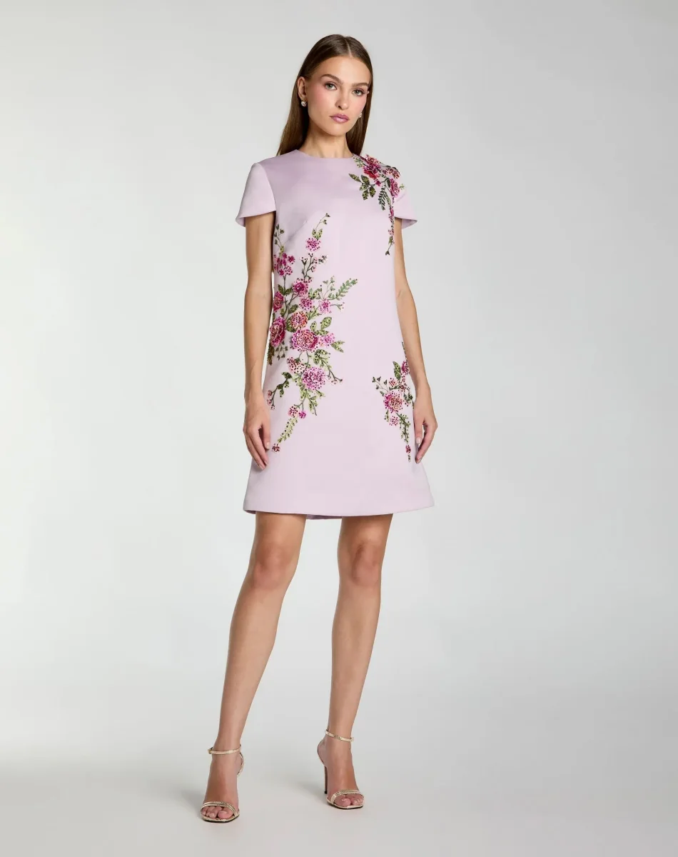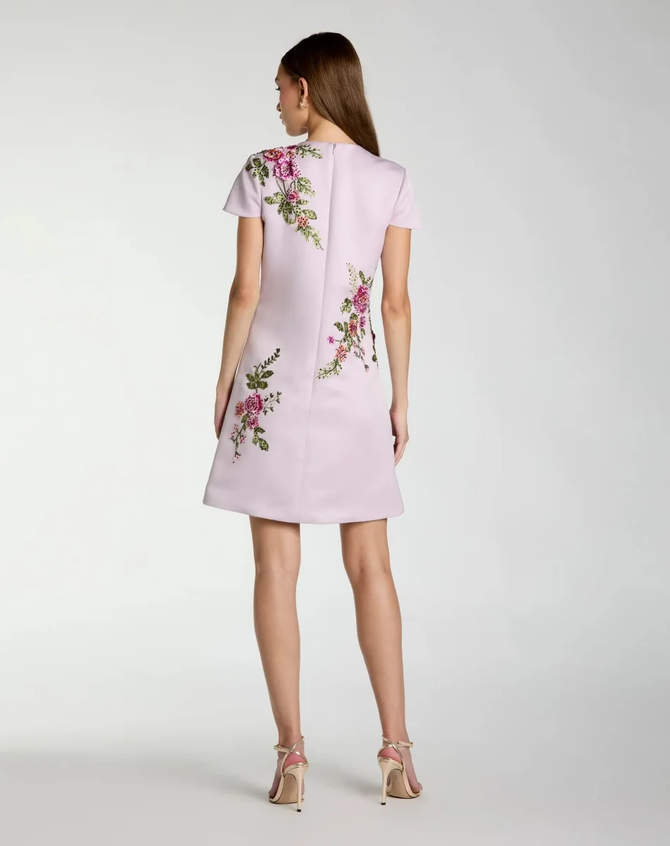 Perfect for cocktail parties and weddings, this mini dress effortlessly blends timeless sophistication with modern charm. Crafted from sleek satin, it features a high neckline, cap sleeve design, and beautifully vibrant embroidered detailing.