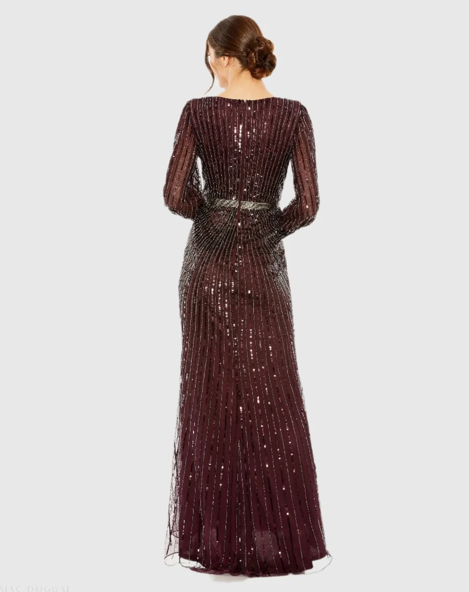 Glamour meets sophistication in this sequined gown. Elegant bishop sleeves, a beaded waist detail, and a striking trumpet silhouette make it perfect for an evening occasion.