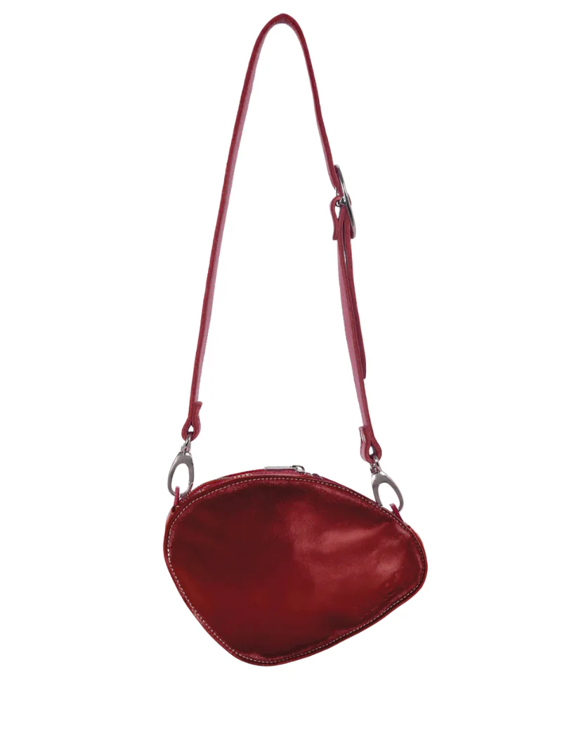 Bolso bandolera con forma ovalada de color granate, piel de vacuno “certificado LWG», estampado del logo en la parte delantera, con un asa para llevarlo a un hombro o cruzado. El asa es ajustable e intercambiable.