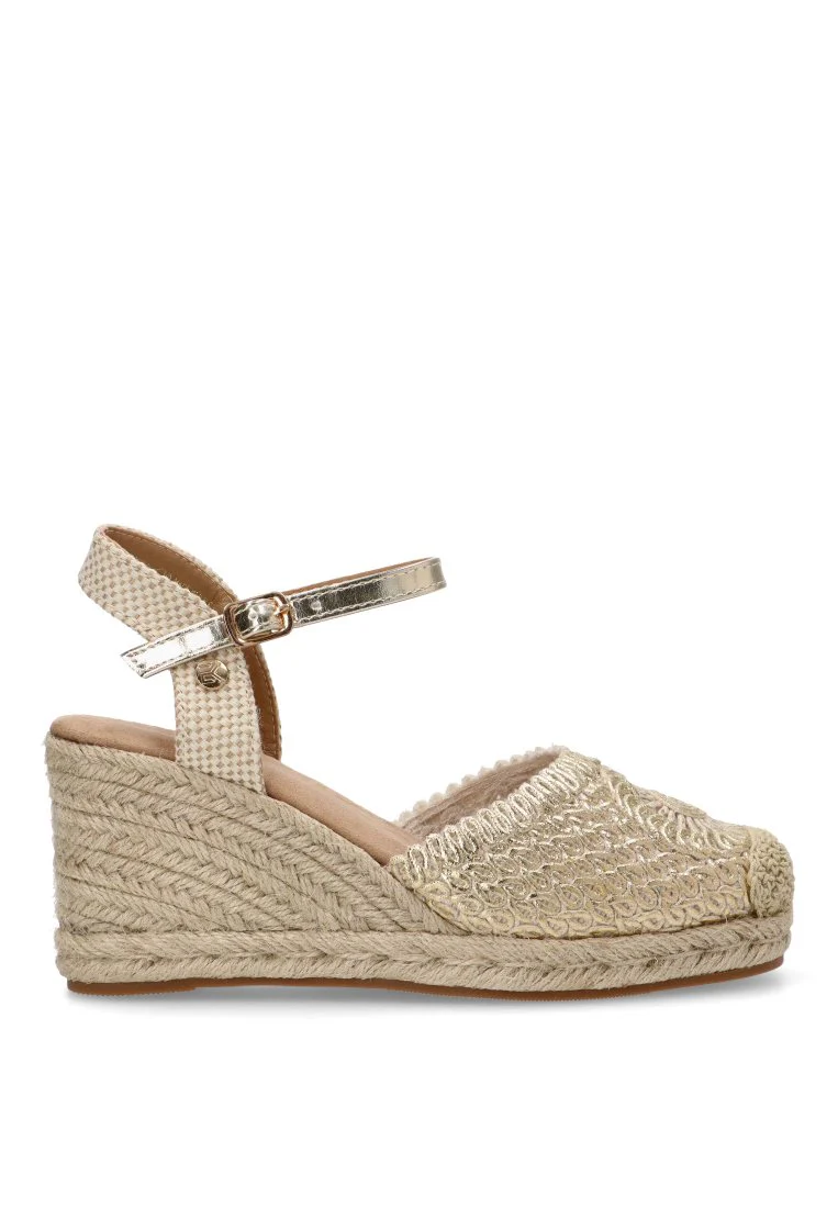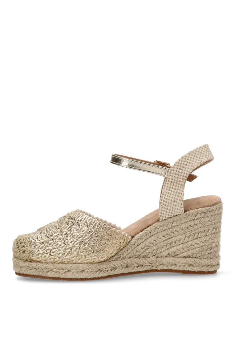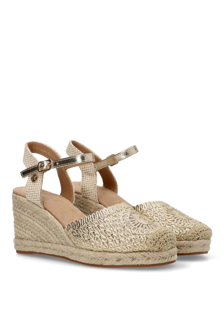 ¿Buscas unas sandalias cómodas, elegantes y con un toque veraniego? Las Valencianas Crochet ETIKA MANELI en color oro son la elección perfecta. Su diseño de crochet y su cuña media las hacen ideales para cualquier ocasión casual de verano.