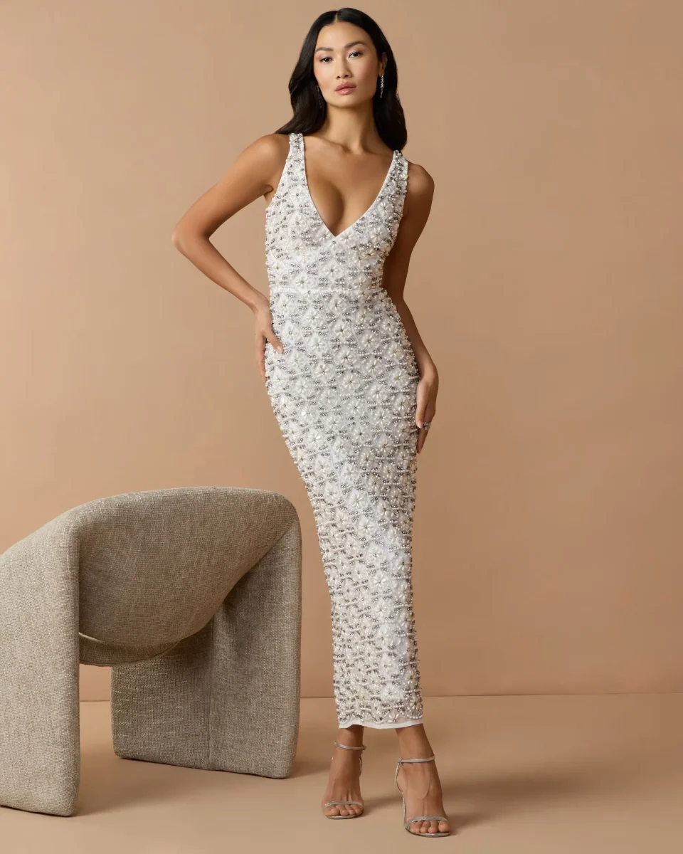 An exquisite display of craftsmanship, this dress features intricate pearl and crystal embellishments and a striking v-back design. The elongated column silhouette and elegant v-neckline create a look that feels both timeless and unmistakably modern.